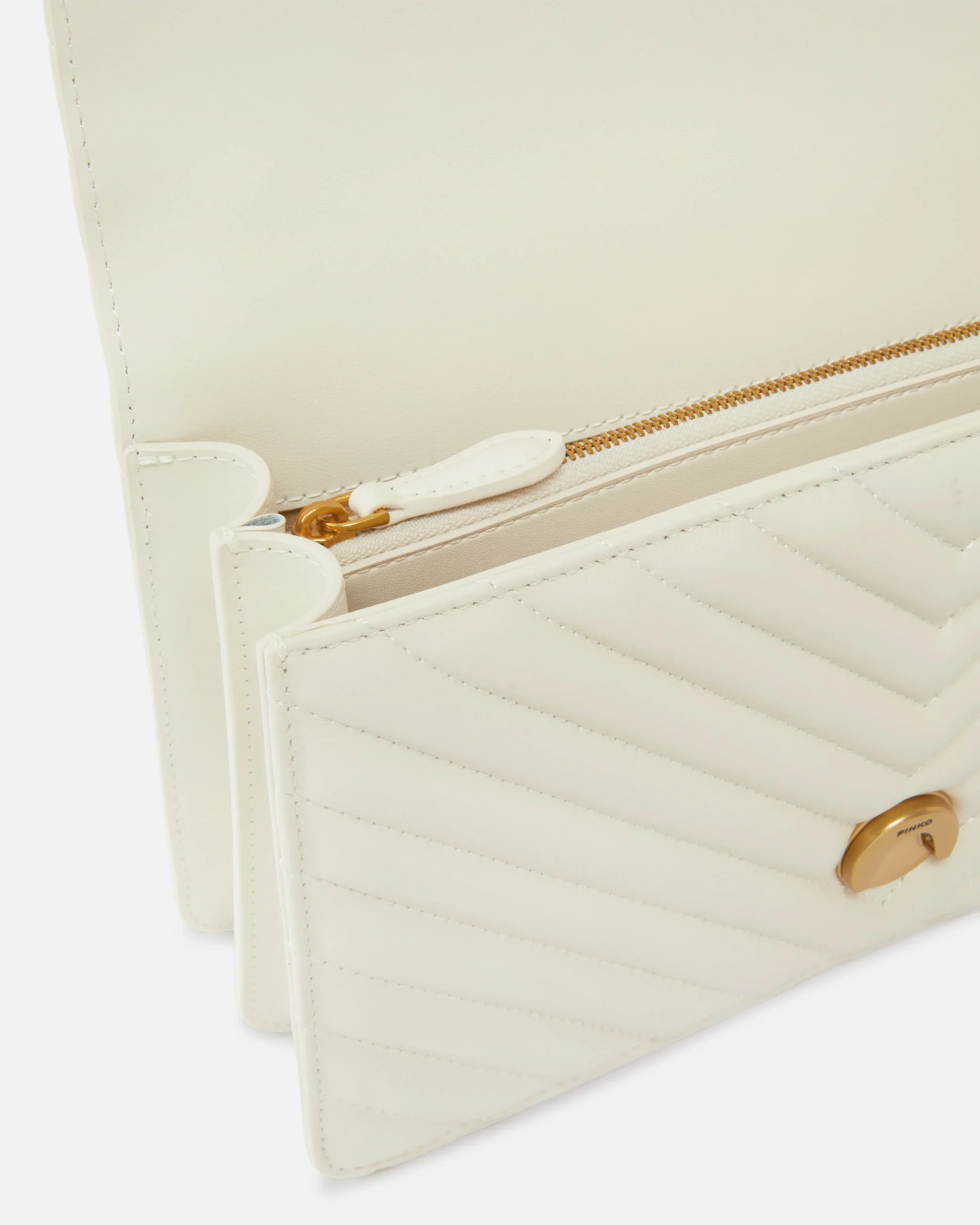 | Περιγραφή | Τσάντα Mini Love Bag One από καπιτονέ δέρμα nappa με σεβρόν σχέδιο. Το κλείσιμο ολοκληρώνεται με την εμβληματική μεταλλική αγκράφα Love Birds Diamond Cut. Το εσωτερικό είναι φοδραρισμένο με ύφασμα από μικροΐνες με σουέτ υφή και διαθέτει διαχωριστικό που κλείνει με φερμουάρ και δερμάτινη τσέπη στο τοίχωμα. Το λουρί συνδυάζει την κλασική στρογγυλή αλυσίδα με το πρακτικό ρυθμιζόμενο δερμάτινο λουράκι ώμου. |